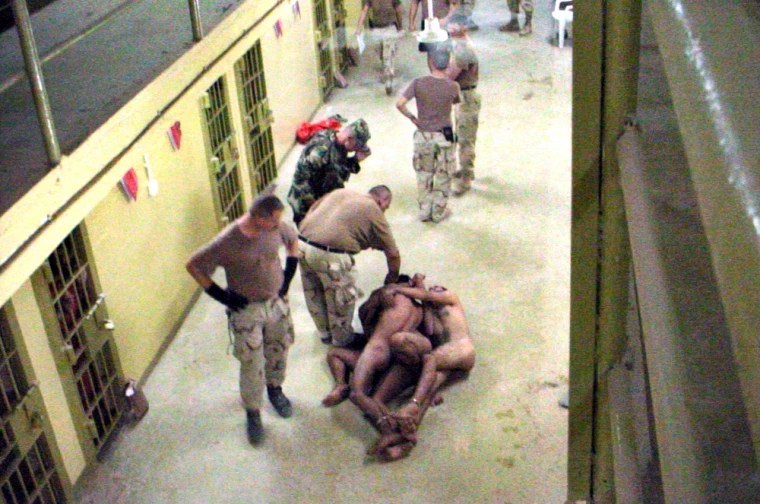 Les photos de la prison d’Abu Ghraid qui on été publiées en 2006, de même que les centaines d’autres resté classifiées, pourraient tout aussi bien avoir été prises sur le plateau d’un film porno. L’une d’elles montre un homme agenouillé devant un autre comme s’il faisait une fellation; sur une autre, on voit un prisonnier tenu en laisse par une soldate américaine. Il y a aussi des clichés d’hommes nus et enchaînés, ou encore d’un groupe de captifs nus, empilés les uns sur les autres même le sol, dans une scène évoquant un « gang bang » carcéral.
